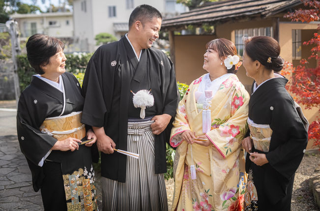 親御様も晴れの日に相応しい装いに身を包み、お二人の門出をお祝いしませんか?ミセスの第一礼装黒留袖と紳士のモーニングは日本の伝統的な親御様のスタイルです。エミールの撮影プランと合わせるとご家族の集合写真は無料にて撮影させていただきます。